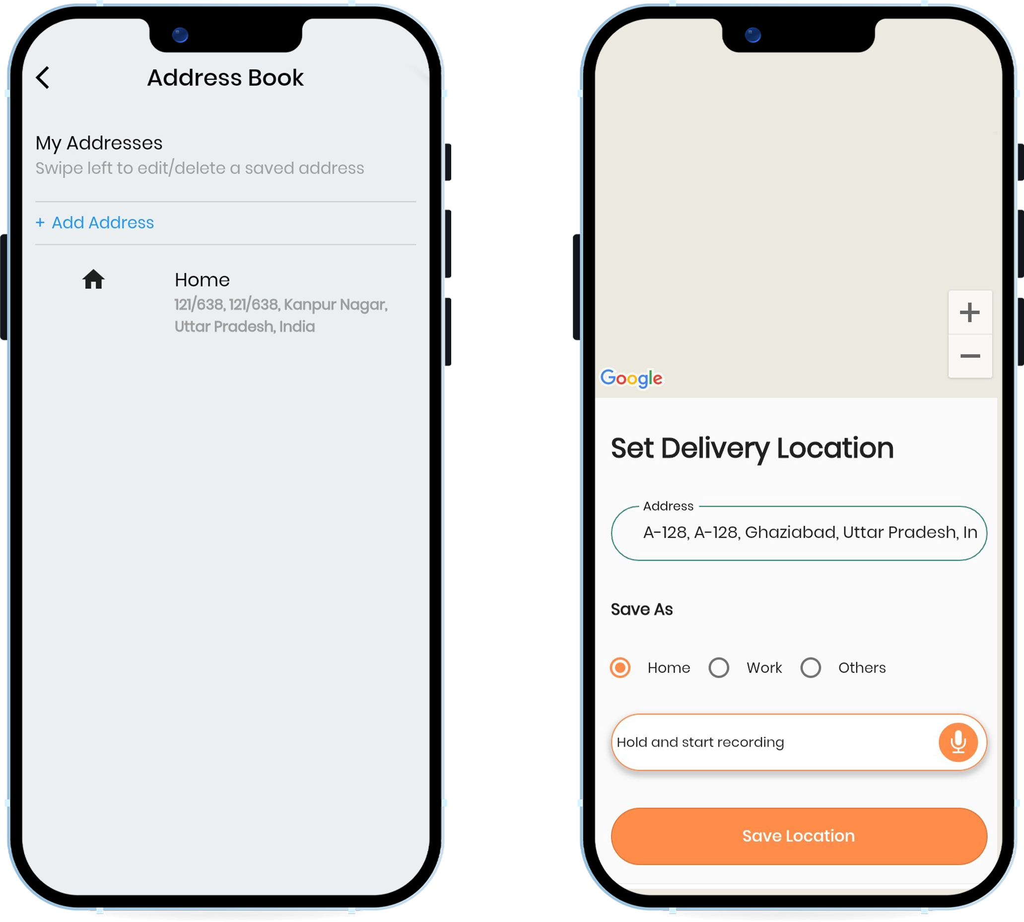 Here, he can enter his delivery location & save it as home, work or others. To set delivery location, even users can hold the audio icon & start recording & save their location.